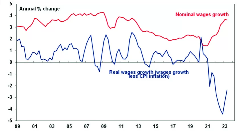2. Real wages growth is improving as inflation slows…but still in negative territory
