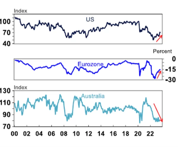 The slowing in headline inflation has led to a rise in real wages growth (the difference between nominal wages and inflation) around the world, although it’s still negative in Australia and the Eurozone. A rise in real wages could see consumers increase spending and lead to a rise in inflation again.